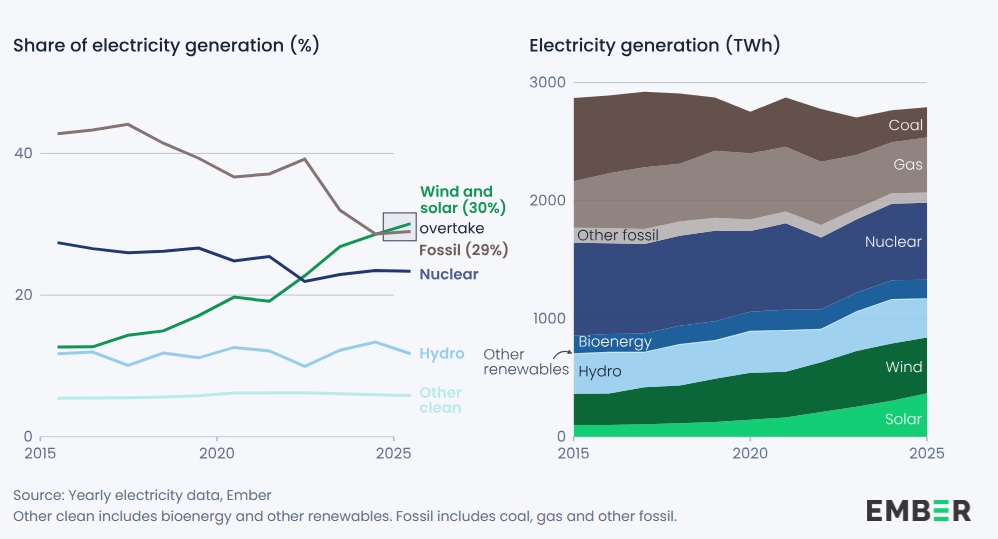 Une page de l’histoire énergétique européenne vient de se tourner. Selon le dernier rapport du think tank Ember, l’année 2025 marque un tournant décisif : pour la première fois, la production combinée d’électricité éolienne et solaire a dépassé celle de l’ensemble des énergies fossiles au sein de l’Union européenne. Cette avancée majeure, portée par une croissance explosive du solaire, confirme l’accélération de la transition énergétique et redessine le mix électrique du continent.