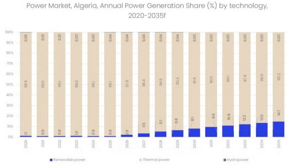 Le paysage électrique algérien est aujourd’hui largement dominé par le thermique, essentiellement alimenté au gaz naturel. Selon une analyse de GlobalData, cette source d’énergie représentait encore environ 97,5% de la capacité installée du parc en 2025. Les projections indiquent que, malgré une légère baisse, le thermique devrait encore constituer 85,2% de la production d’électricité à l’horizon 2035.