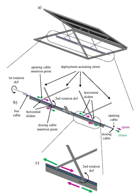Le mécanisme de déploiement utilise un câble navette en boucle connecté à des câbles d’ouverture et de fermeture, chacun enroulé autour d’un treuil externe. Cette configuration technique robuste permet de grandes rotations aux extrémités des tiges, assurant un suivi solaire précis avec une consommation énergétique minimale.